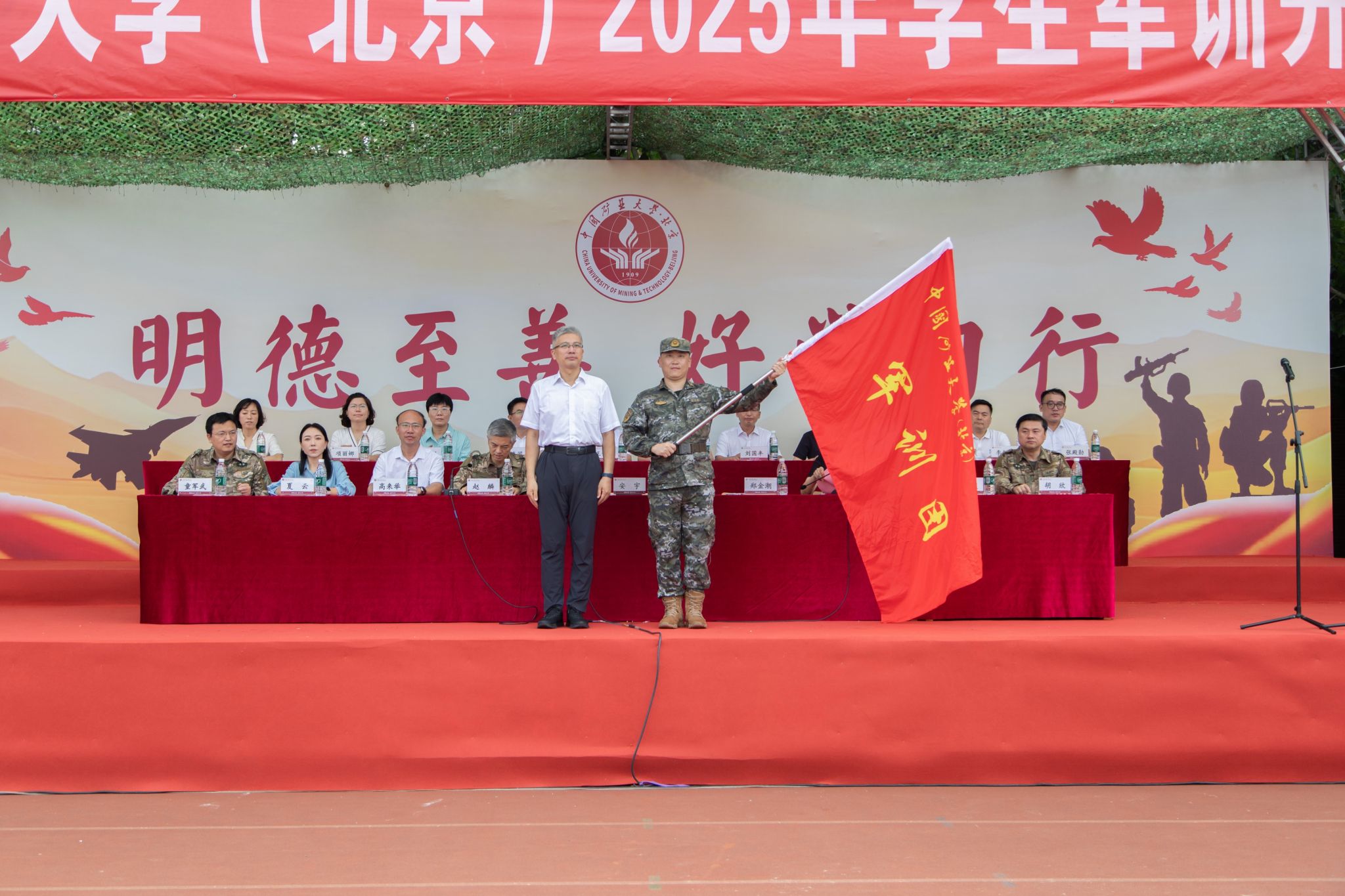 会上,安宇向军训团团长授中国矿业大学(北京)军训团团旗。