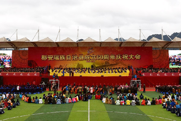 杨仁树对都安建县60周年致以节日的祝贺,表示都安县在中央、各级政府、单位的支持下,在县委、县政府的领导下,县域经济不断壮大、人民生活不断提高。我校作为中央国家机关定点扶贫单位,将按照国家扶贫办和教育部的统一部署和安排,一如既往地支援都安县打好脱贫攻坚战。