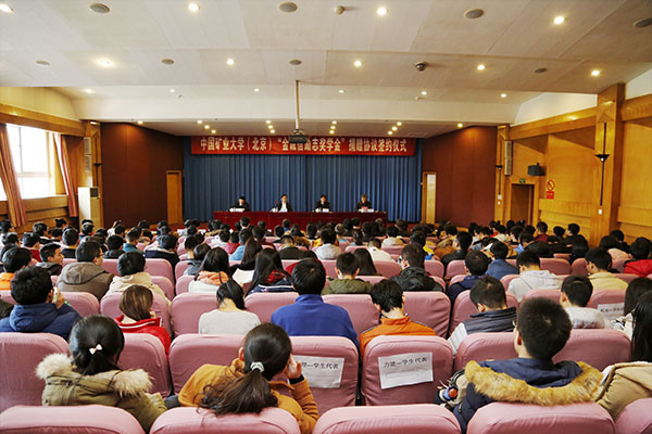 王先成在致辞中表示,金诚信公司是一家有着近20年历史的民营企业,随着国家改革开放的不断深入,公司规模不断壮大,致力于成为具有国际竞争力和影响力的矿山开发服务企业。他希望矿大学子热爱矿业事业,学有所成,也欢迎广大同学加入到金诚信;希望校企双方今后进一步拓宽合作渠道,提高合作层次,推动人才培养协作,实现互利共赢。