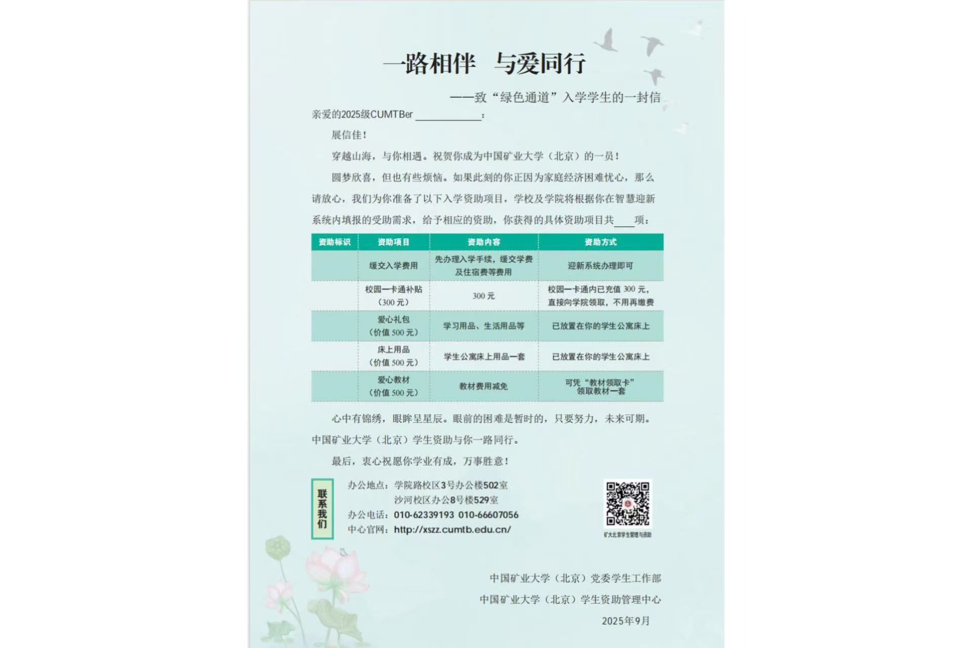 本网讯 中国矿业大学(北京)以精准研判学生需求、激励学生成长成才为工作目标,在充分保护学生隐私的工作前提下,广泛宣传资助政策、个性定制资助礼包,新生入学“绿色通道”全程线上办公、所有资助物资在学生报到前已配送到床位,为家庭经济困难新生带去暖心服务、无声关爱,确保每一位新生都能顺利入学。