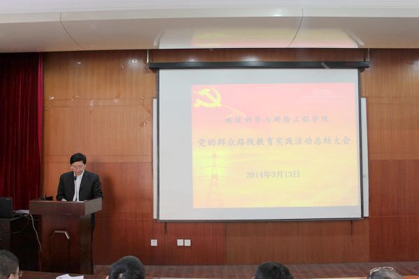 3月13日,地球科学与测绘工程学院在民族楼135会议室召开了党的群众路线教育实践活动总结大会。校党的群众路线教育实践活动督导组办公室主任、校党委组织部部长邹得志,地测学院院长曹代勇、院党委书记唐跃刚、副院长崔希民、邵龙义、院党委副书记鲍玲出席会议,学院全体教师和部分学生代表参加会议。会议由鲍玲主持。