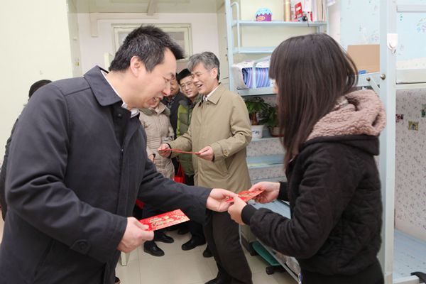 张永凯深入学十楼、学八楼学生宿舍,亲切看望留校学生,仔细询问了他们的学习、生活情况。他代表中共北京市委教育工委、北京市教委对留校学生表示慰问,向大家拜年,希望学生在北京过一个快乐、平安、幸福的春节,并通过大家给家人祝贺新春佳节。他希望留校学生抓住寒假机会,多学习,多锻炼。他亲手将温暖大礼包和红包发给留校学生,带来了北京市对大学生们的关爱和温暖。