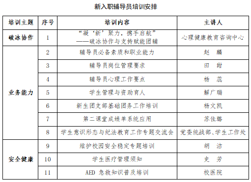 为帮助新入职辅导员系统掌握学生工作各领域核心业务知识,学校紧扣岗位需求精心设计培训方案,针对性开展破冰协作类、业务能力类、安全健康类专项培训共计16学时。培训融合理论讲解、交流研讨、团体辅导等多元化形式,助力新上岗辅导员清晰掌握工作规范、精准把握育人方向、全面提升业务能力,为高效开展学生工作筑牢坚实基础。