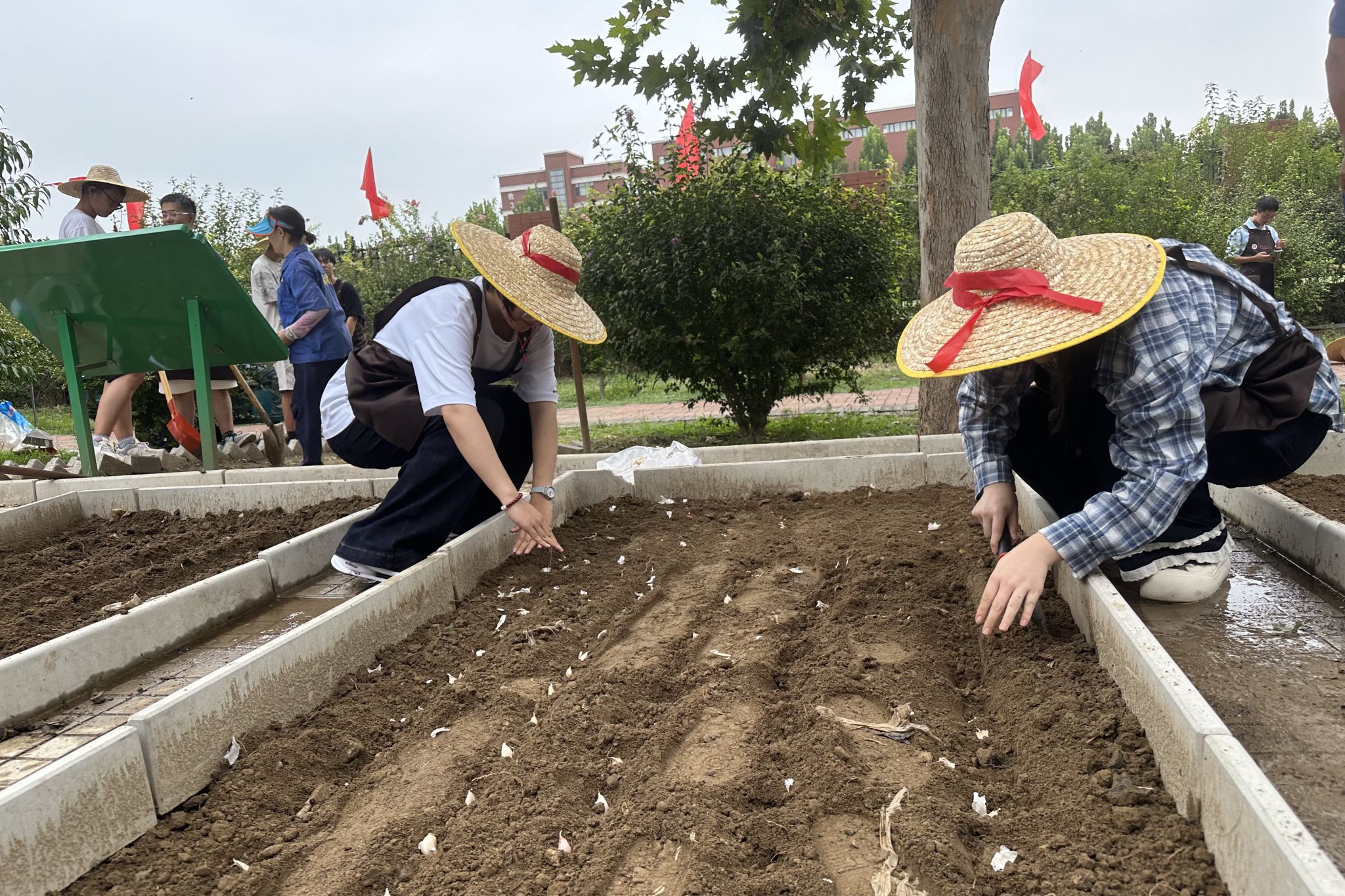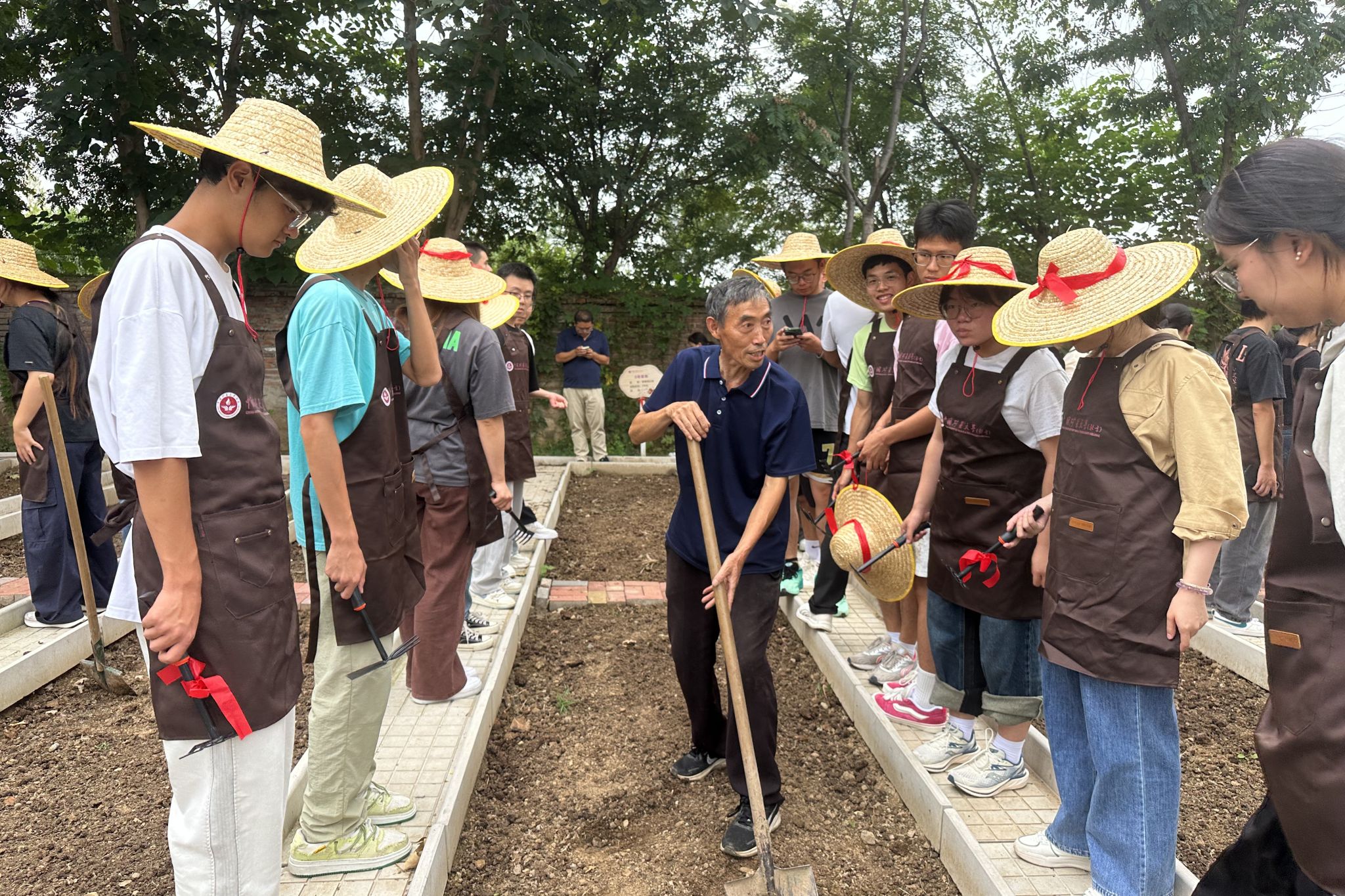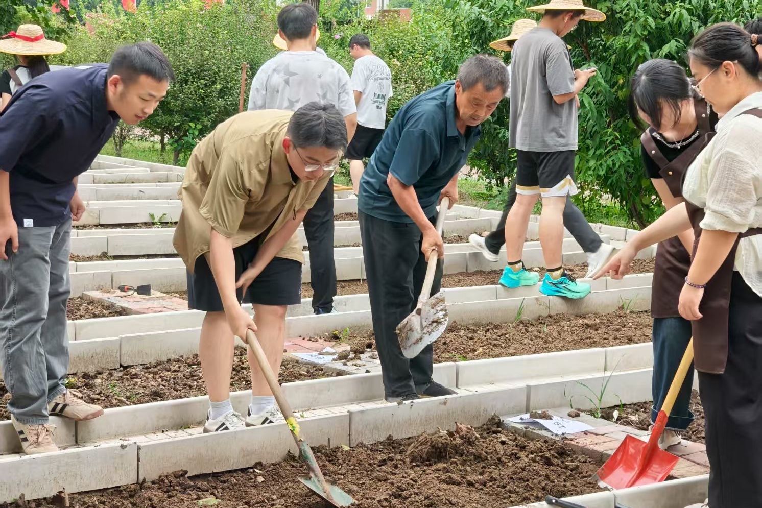 理论知识化为实践动力,同学们分组奔赴各自认领的“责任田”。铁锹起落间,坚实的土地被翻出层层新土;耙子轻划时,土块被细细耙碎,菜畦逐渐变得平整松软。有人专注翻土,汗水浸湿衣背;有人仔细播种,将希望的种子轻撒入土;还有人互相协作,在劳动中默契渐生。校园的农耕区里,草帽、围裙与农具交织出一幅充满活力的劳动图景。