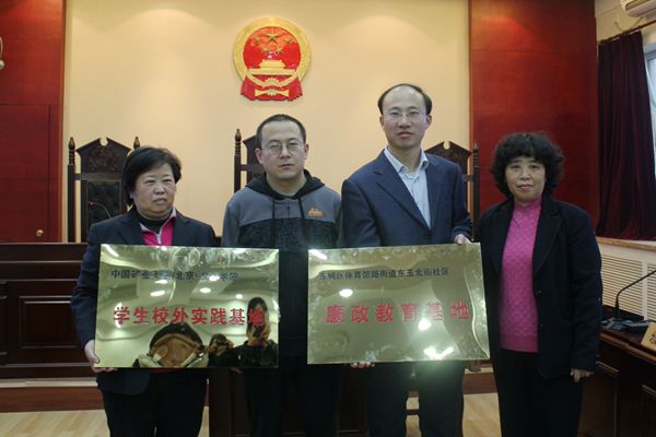 会上,殷召良、唐兵兵共同为“中国矿业大学(北京)文法学院学生校外实践基地”、“东城区体育馆路街道东玉北街社区廉政教育基地”揭牌,毛沪花、高来举签订了合作共建协议书。