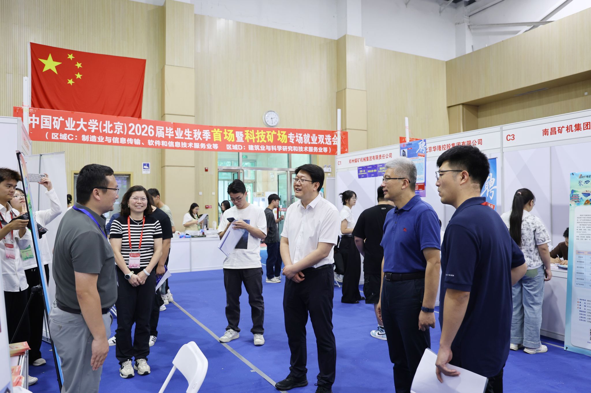 本网讯 9月26日下午,学校在体育训练馆举办了2026届毕业生秋季首场暨“科技矿场”专场就业双选会。校党委书记韩尚峰、校党委副书记安宇出席双选会,深入会场调研指导,与用人单位代表、求职毕业生亲切交流,实地推进高质量就业工作。