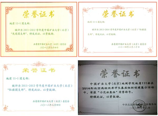 班级荣誉:2011-2012学年度学校先进团支部、红旗团支部、2013-2014学年度学校红旗团支部、2014年北京高校“我的班级我的家”示范班集体