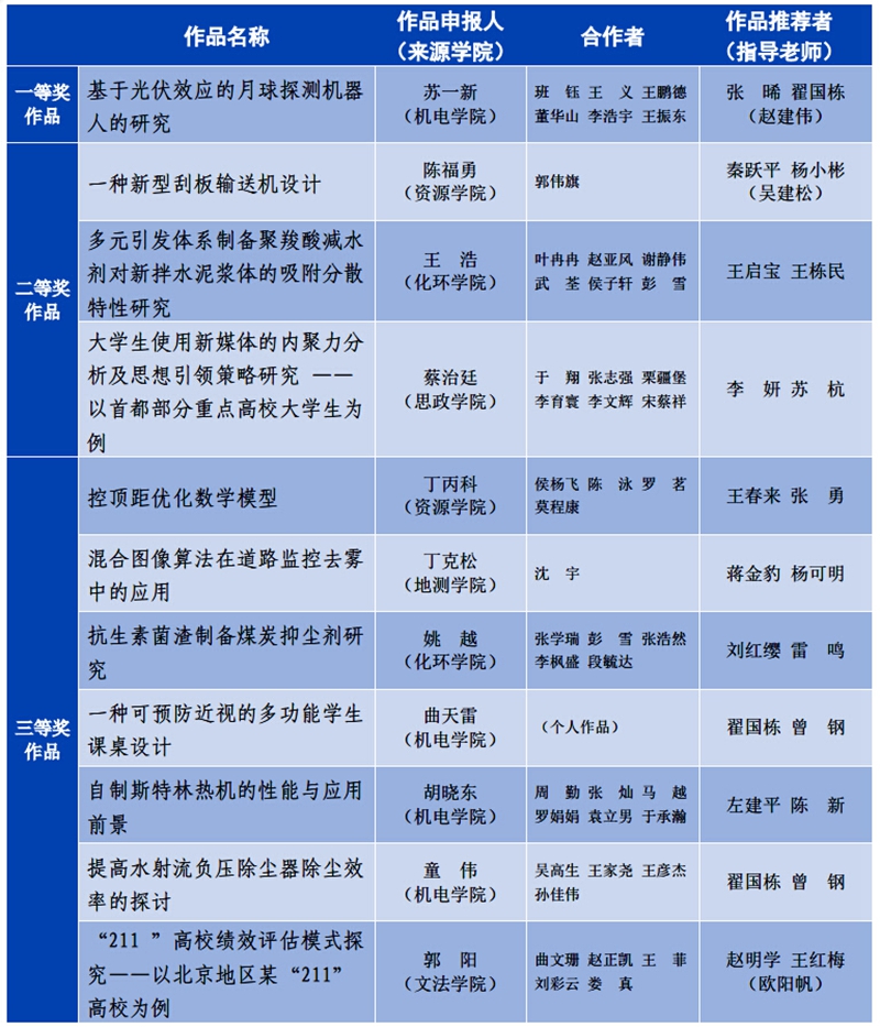 近日,首都“挑战杯”官方网站公布了第八届首都大学生课外学术科技作品竞赛成绩,我校申报的15件参赛作品中,有1件获得一等奖,3件获得二等奖,7件获得三等奖。获奖作品涵盖机械与控制、能源化工、信息技术、教育、管理等领域。