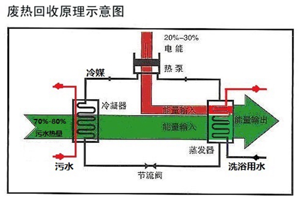 浴室废热回收系统主要由污水池、热回收机组、储热水箱、污水排放系统、控制系统等部分组成。其原理示意图如下。