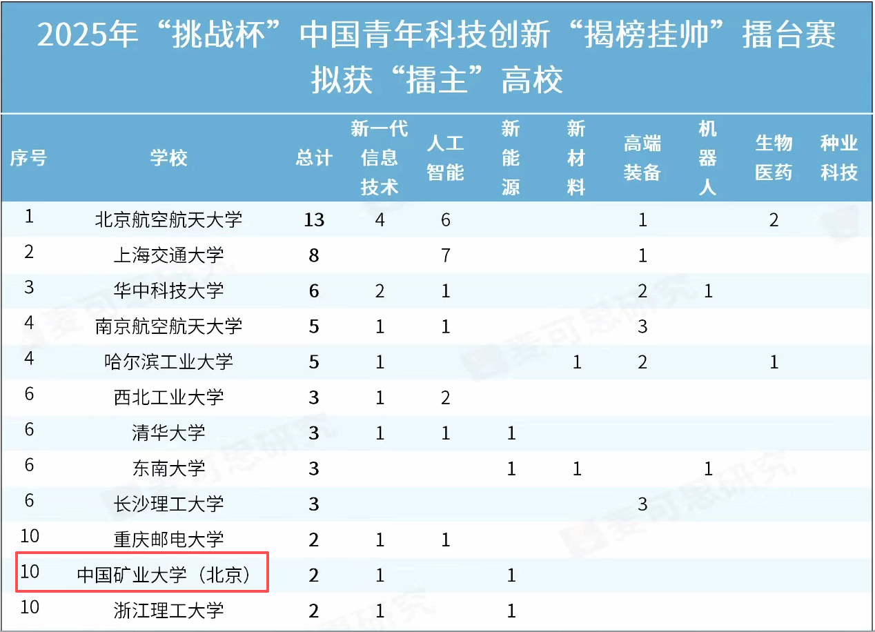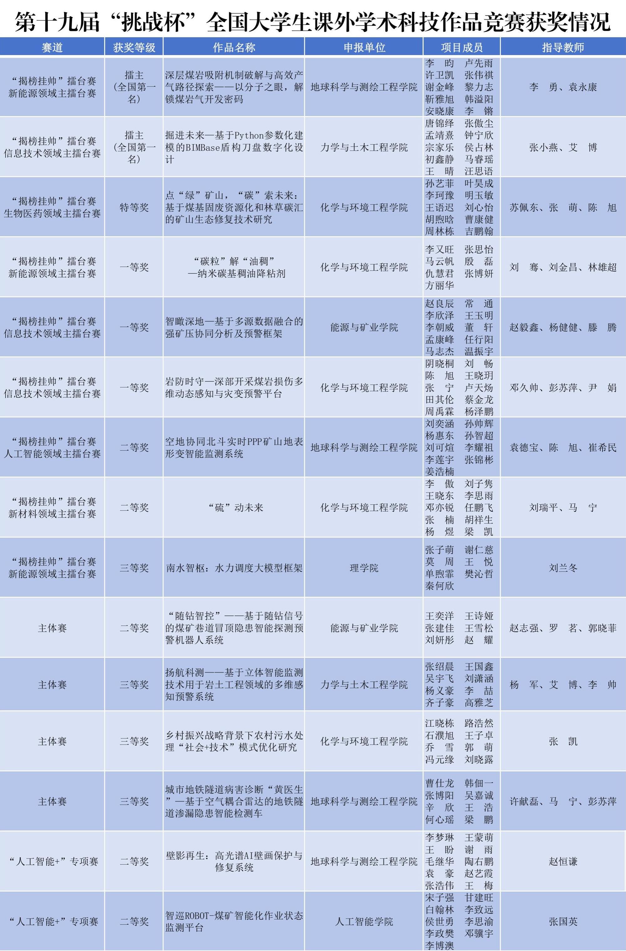 “揭榜挂帅”擂台赛成绩优异,获擂主2项(全国第一名),擂主数量位列全国高校第十,同时获特等奖1项、一等奖3项、二等奖2项、三等奖1项,项目围绕深层煤岩气开发、盾构刀盘设计、矿山生态修复等关键领域攻关,为能源开发、工程建设、生态保护提供技术方案,彰显服务国家战略的学科优势。