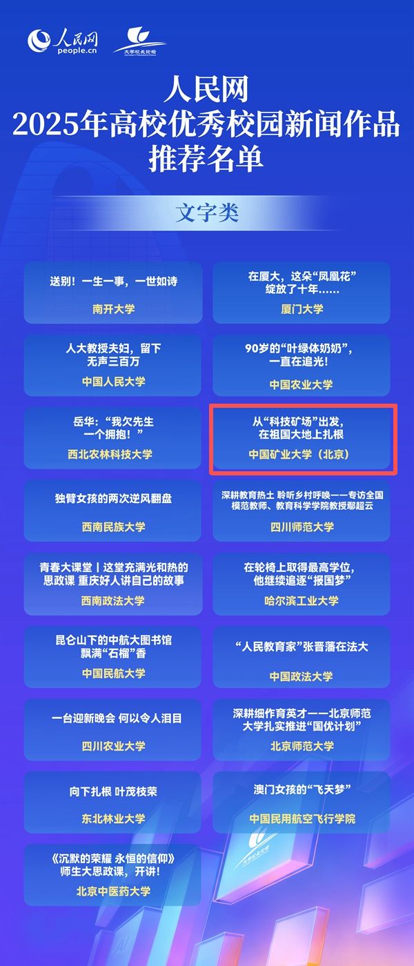 中国矿业大学(北京)力学与土木工程学院2022级力学专业博士生张鸣原撰写的通讯《从“科技矿场”出发,在祖国大地上扎根》,入选人民网2025高校优秀校园新闻作品——文字类,全国共有17篇高校文字类作品入选。