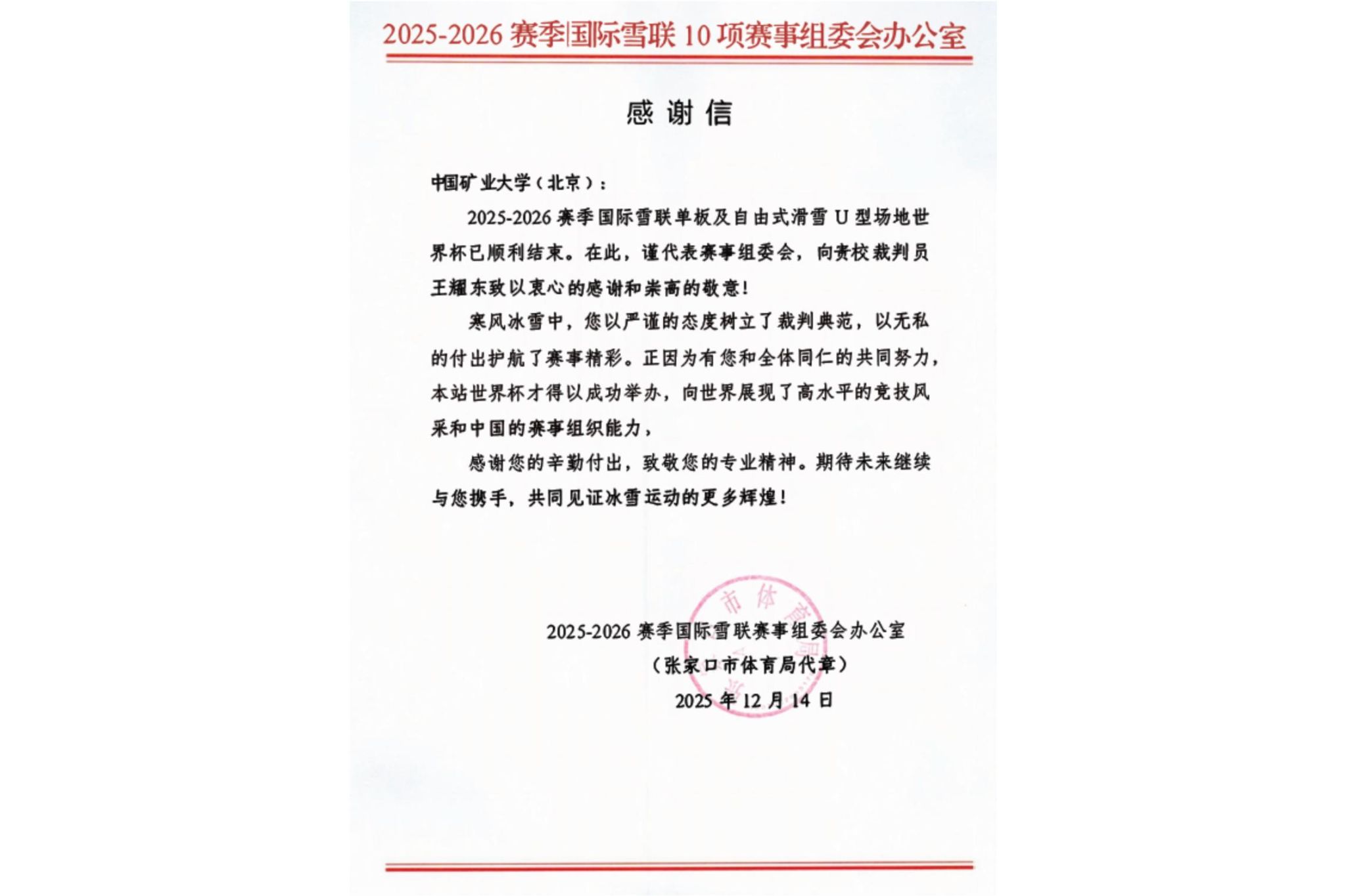 2025-2026赛季国际雪联10项赛事组委会办公室向学校发来感谢信