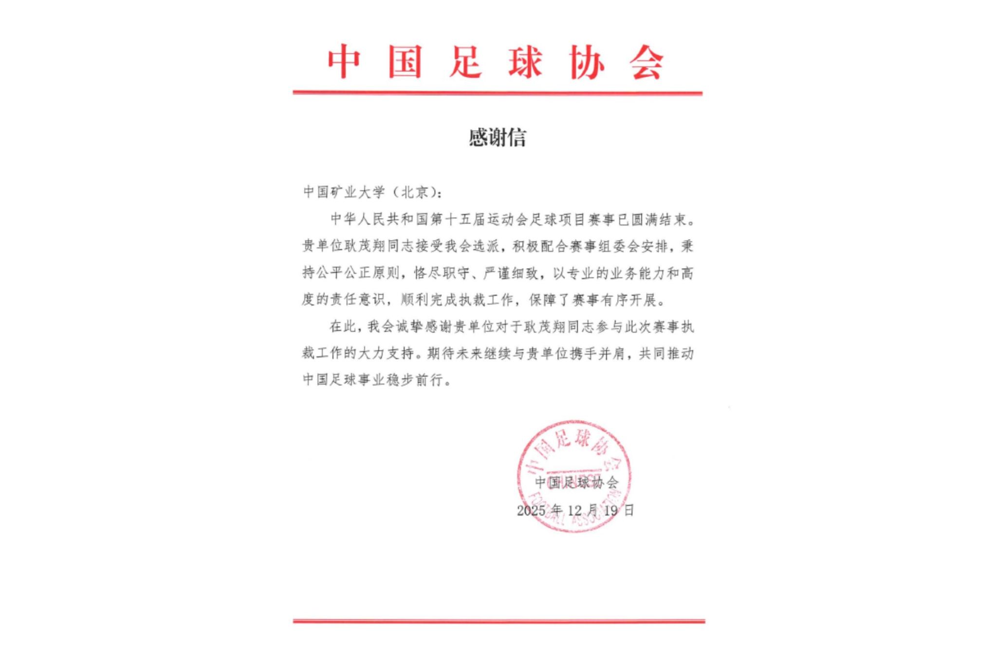 中国足球协会向学校发来感谢信