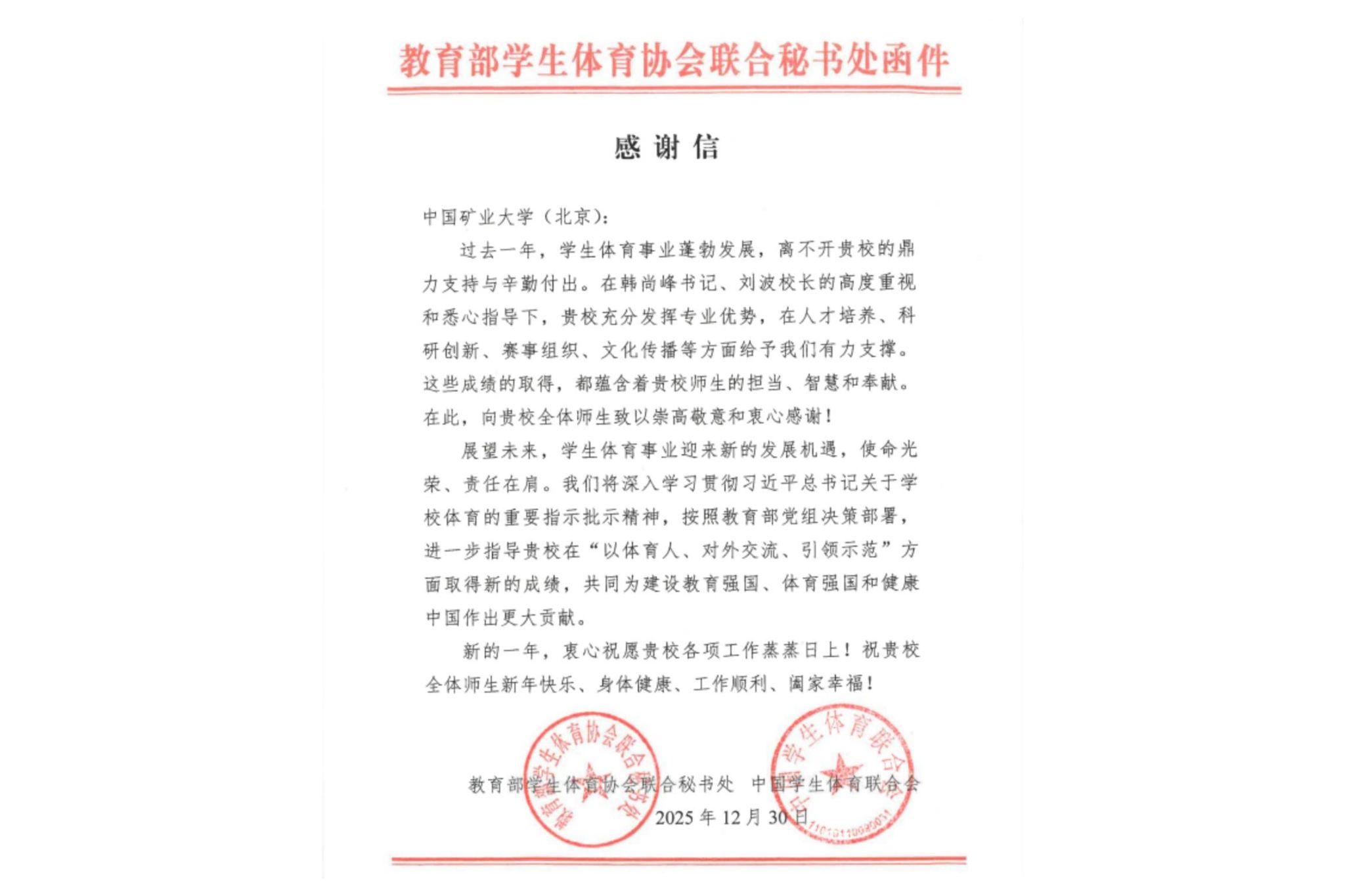 教育部学生体育协会联合秘书处、中国学生体育联合会向学校发来感谢信