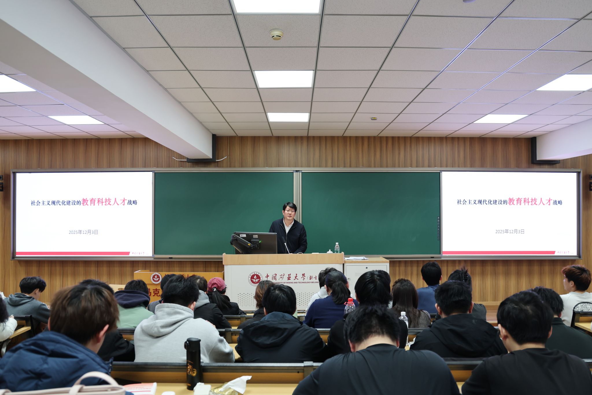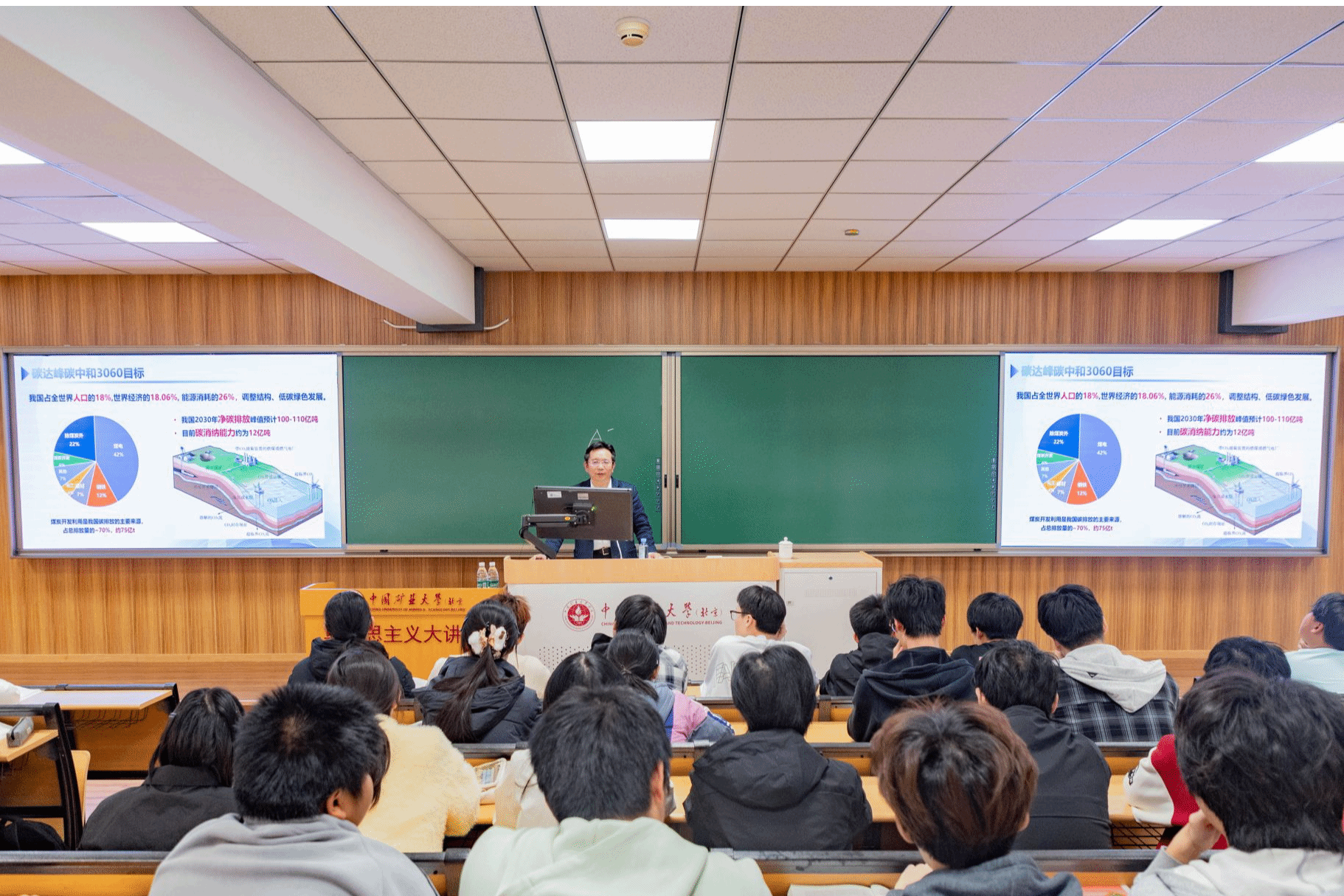 刘波以《更好端牢能源的饭碗 建设美丽中国——矿大(北京)实践》为题进行授课,深刻阐释“双碳”目标下能源行业高校服务国家战略需求的使命担当。他通过煤基能源碳闭环系统、太空资源与太空采矿等前沿科技案例,深入剖析了煤炭作为“能源安全压舱石”的兜底保障功能,生动阐释了能源行业在绿色发展中的创新突破路径。他结合学校新能源科学与工程、碳储科学与工程等学科专业布局,强调技术创新与人才培养对发展新质生产力的支撑作用。课程最后,刘波以“科技自立自强为何如此紧迫”“绿色发展,矿大何为”启智广大学子,勉励大家立足专业特色,在绿色发展、全球生态治理等重大时代课题中勇担能源报国、科技强国使命。