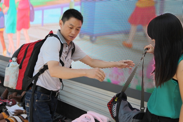 楚佩终于把父亲手中的一个包“抢”了过来,父亲手伸着还想“夺”回去,可是她一下子跑开了。