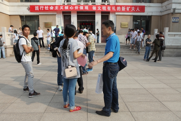 人虽多但秩序井然,民族楼前挂着的条幅上写着——“做文明有礼的新矿大人”。