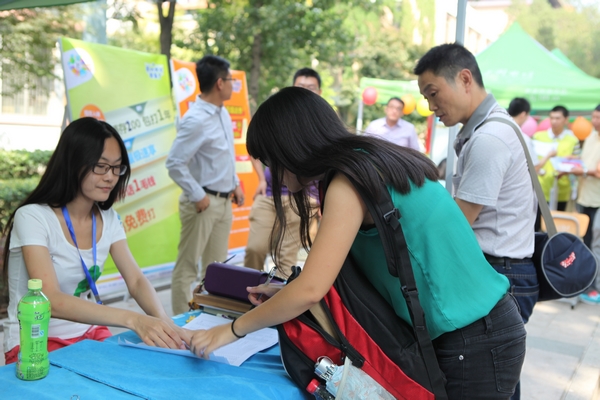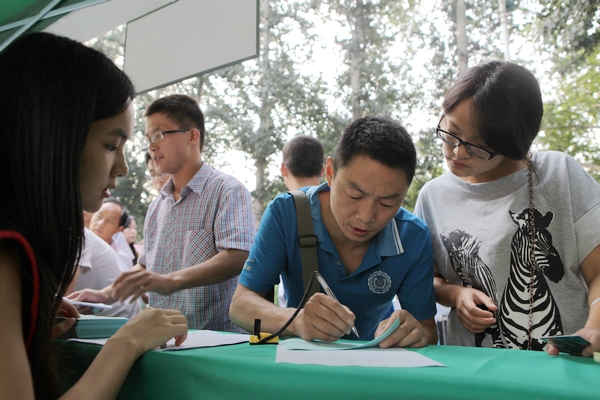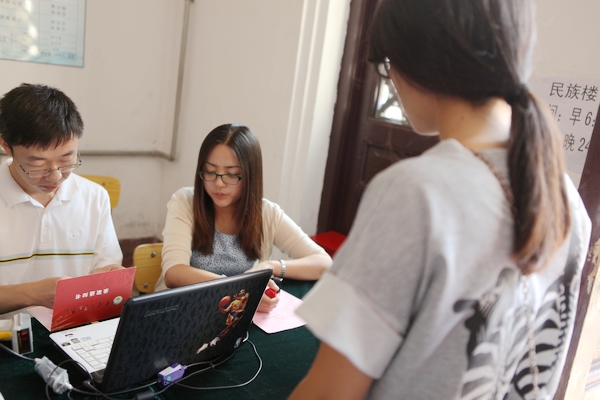 由于办理了生源地贷款,楚佩和父亲来到了学校的“绿色通道”填写相关表格。