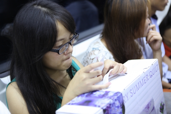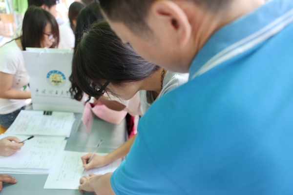 工作人员老师有条不紊地给楚佩查验录取通知书,办理各项手续。