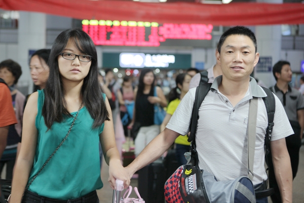 像所有经历远途的旅客一样,父女俩提着几个大包,拖着行李箱从车站出来。