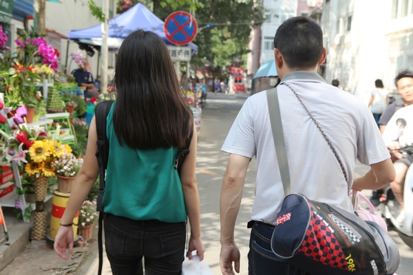 自从父亲的背包被女儿“抢”走后,父亲就一直想偷偷拿走郦楚佩提着的被套,不料被郦楚佩发现,手一使劲,大步向前走。