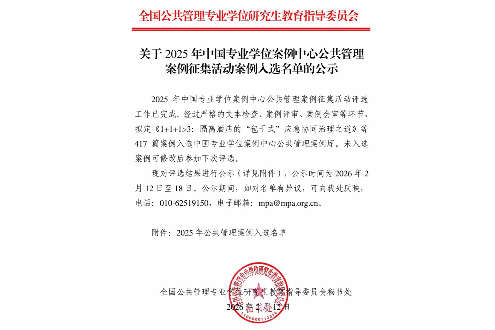 本网讯 近日,全国公共管理专业学位研究生教育指导委员会公布2025年中国专业学位案例中心公共管理案例征集活动入选名单,学校12篇案例从全国众多申报案例中脱颖而出,成功入库。全国共有417篇案例入库,学校入选数量位居全国高校前列。此次入选的案例均为学校两届MPA案例大赛中的优秀作品,数量颇丰、质量过硬,彰显了学校公共管理学科教学与研究的扎实实力,也标志着学校MPA人才培养与案例建设工作迈上新高度,更为全国公共管理专业学位研究生培养提供了优质的教学资源。