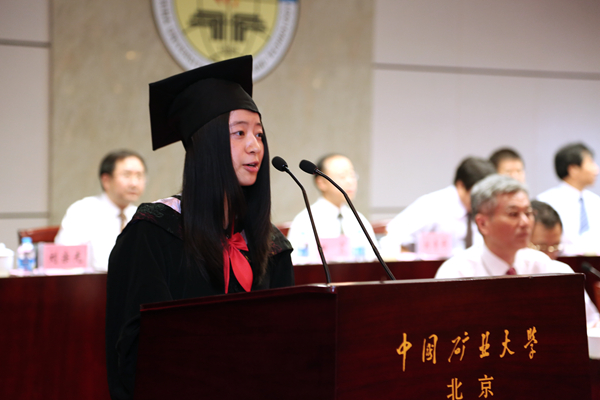 毕业生代表、文法学院吴越同学代表全体毕业生,向辛勤培育同学们的各位领导、老师表达最衷心的感谢,向多年来辛勤操劳的父母表示最崇高的敬意,向四年来朝夕相处的兄弟姐妹表达最真最诚的祝福。她表示,将传承矿大的百年精神,牢记着 “勤奋、求实、进取、奉献”, 在不同的岗位上为社会做出各自的贡献。