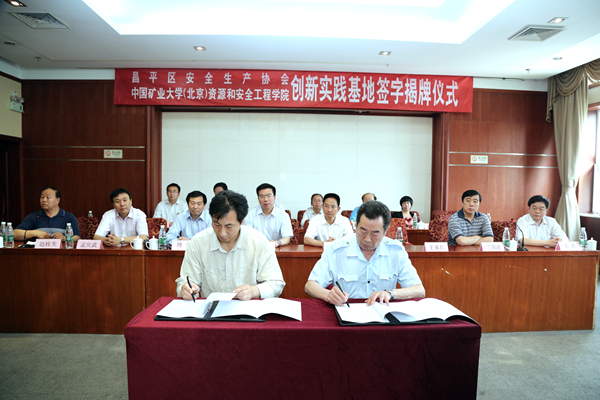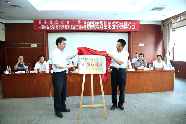 5月22日上午,我校资源与安全工程学院和昌平区安全生产协会创新实践基地签字揭牌仪式在昌平区举行。我校副校长王忠强、昌平区副区长苏贵光出席仪式并为“中国矿业大学(北京)安全工程创新实践基地”揭牌。北京市安全监察局、北京市安全生产协会、昌平区安全监察局、昌平区安全生产协会和中国矿业大学(北京)资源与安全工程学院等有关单位代表及安全生产协会会员单位代表参加了仪式。仪式由昌平区安全生产协会会长赵桂生主持。