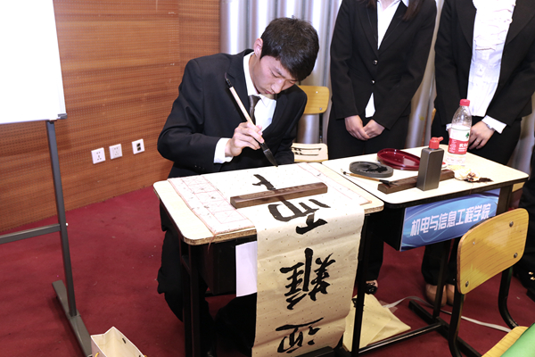 比赛分为“听写大会”、“足智多谋”、“挥毫泼墨”三个环节,既考验汉字书写的准确性,也考验了选手对中华传统文化和我校百余年办学历史的熟悉程度。而外国友人的踊跃参与和现场观众的积极互动,更是将活动一次次推向高潮。比赛场上各学院代表队的分数你追我赶,场下也是掌声不断笑声阵阵。在“挥毫泼墨”环节,各学院代表队纷纷拿出自己的看家本领,现场书写书法作品,赢得了满堂喝彩。