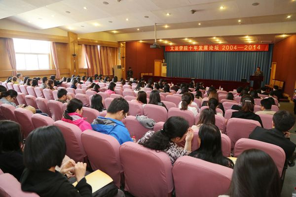 4月20日,“文法学院十年发展论坛2004-2014”在交流中心报告厅举行。副校长王忠强出席论坛并致辞,思想政治教育学院院长田霞、党总支书记李妍,国际合作与交流处处长王红梅、苏杭教授等出席。学院领导班子成员、全院教师、近80名校友和部分在校生代表150余人参加论坛。院党委书记殷召良主持了论坛,