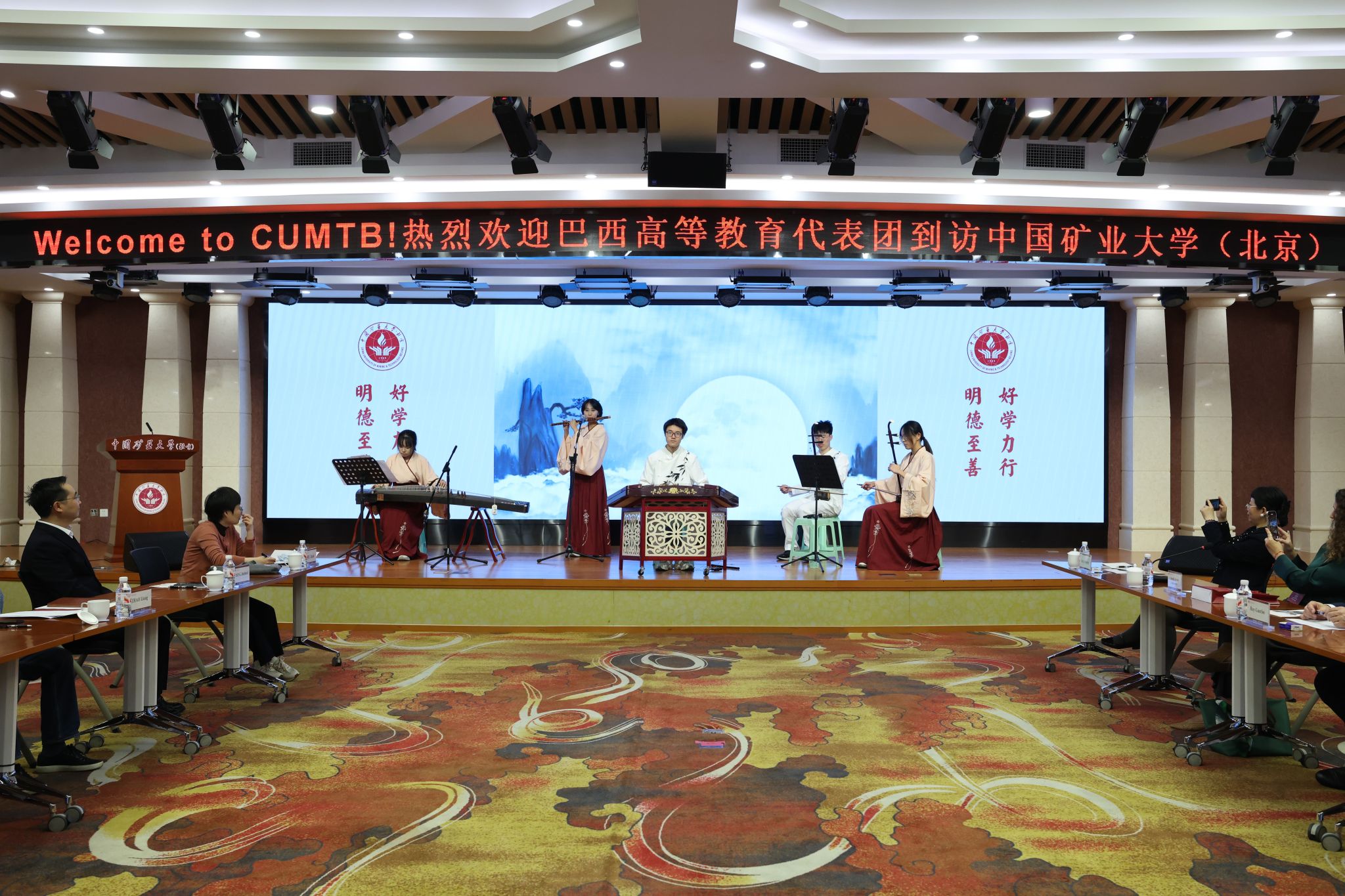 本网讯 4月22日下午,由46位巴西高校及教育机构负责人组成的巴西教育访问团来访学校,双方就深化中巴高等教育合作、推动绿色智慧矿山建设及卓越人才培养等议题展开深入交流。校长刘波会见代表团并致辞,副校长崔希民主持交流座谈会,中关村绿色矿山产业联盟秘书长王亮出席活动。校学生艺术团在开场活动中用传统乐器表演献礼2026中巴文化年,与会人员反响热烈。