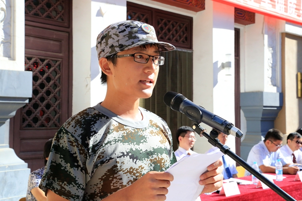 学生代表张帆代表参训学生对学校和教官致以崇高的敬意和真诚的感谢,表示将把军训中收获的宝贵财富转化为好学力行的强大动力,转化为拼搏进取的蓬勃朝气,志存高远,将个人理想与伟大的中国梦切实结合起来,不懈奋斗!