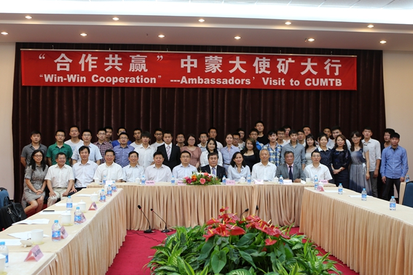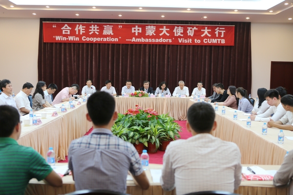 6月27日下午,蒙古国驻中国大使策·苏赫巴特尔、高级参赞胡仁巴特尔、一等秘书白格勒玛,中国驻蒙古国大使王小龙,中国神华能源股份有限公司总裁凌文、神华集团总经理助理兼神华海外公司董事长邵俊杰、神华集团海外开发投资有限公司综合办公室主任亓龙亮、外交部亚洲司翻译王强等来访我校。中国矿业大学(北京)党委书记杨仁树会见了代表团,副校长姜耀东主持会谈,深部岩土力学与地下工程国家重点实验室主任何满朝、资源与安全工程学院院长王家臣、地球科学与测绘工程学院院长曹代勇、国际合作与交流处处长王红梅、副处长杨英以及我校30余名中、蒙学生代表等参加了会谈。