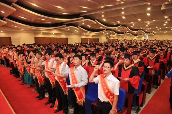 典礼最后,全体2013届研究生起立,举起右手庄严宣誓:“铭记师长教诲,弘扬矿大精神,崇尚科学、追求真理,艰苦奋斗、勇于创新,迎难而上、不断进取,奉献社会、服务人民,肩负起时代赋予的光荣使命,为祖国富强不辞劳苦,为民族的复兴奋斗终生!”誓言掷地有声,响彻会场,久久不息。