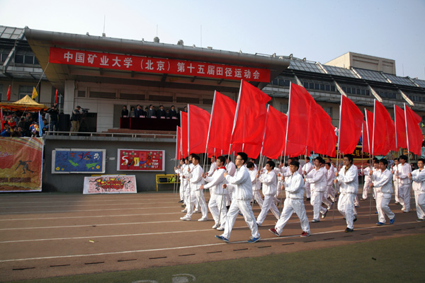 上午8:00,副校长范迅宣布运动会开幕。伴随着雄壮的运动员进行曲,护旗手庄严地护送五星红旗入场,紧随其后的是裁判员和各学院、各分工会运动员代表方队。整齐的步伐、响亮的口号展现着矿大人在进京办学60年来一直秉承的优良的精神风貌,表达了全校师生在党的十八大精神鼓舞下,为实现“中国梦”而不懈努力的决心和信心。随后,在庄严的国歌声中,全体人员面向国旗举行了升旗仪式。