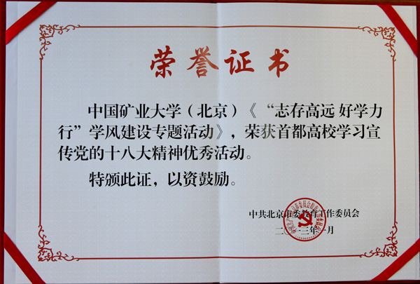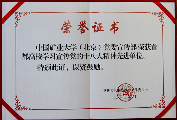 会上,表彰了2012年北京高校宣传教育工作各类先进集体和个人,交流了工作经验。我校援疆教师陆明心被评为“2012首都十大教育新闻人物”。我校党委宣传部被评为北京高校学习党的十八大精神先进单位,党委学生工作部组织开展的“志存高远,好学力行”学风建设专题活动被评为北京高校学习党的十八大精神优秀活动。我校党委宣传部开展的“追寻百年矿大的建设者”,党委学生工作部开展的“坚持教育改革创新、狠抓学风建设落实”,思想政治教育学院的“开设思想政治理论实践课、提高教育教学时效性”等工作作为2012年北京高校宣传教育工作亮点进行了展示。