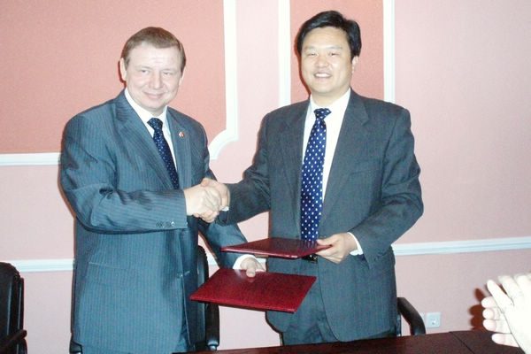 乔建永校长与俄罗斯工程院院士莫斯科矿业大学科尔查克校长(左1)在莫斯科签署两校合作协议,为申报国家外专局项目做准备。特别讨论了来华专家的工作时间安排问题。