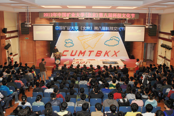 在与会领导共同按下手中遥控器在瞬间,机器人举起手臂,推倒了多米诺骨牌以及用无数纸杯摆放的巨型幕墙,呈现了“中国矿业大学第八届科技文化节盛大开幕”背景,使现场气氛达到高潮。