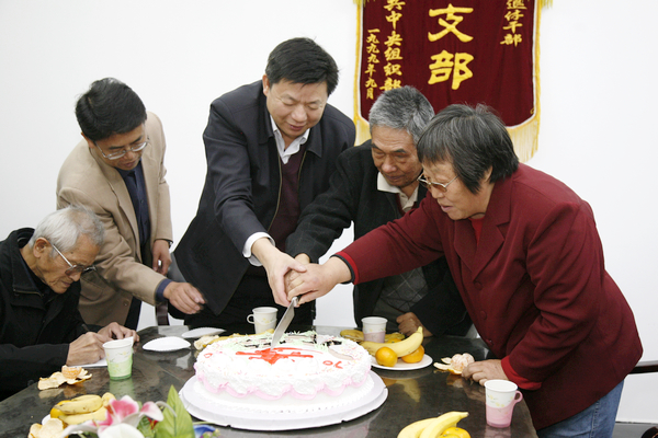 校党委书记杨仁树与老同志们一起切蛋糕