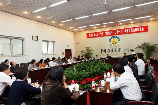 杨仁树代表学校党委做贯彻执行“三重一大”决策制度情况汇报。简要汇报了学校基本情况,重点围绕学校贯彻“三重一大”决策制度情况,2011年7月以来学校贯彻“三重一大”决策事项情况以及存在的问题和改进措施等做了详细汇报。乔建永主持会议并简要汇报了学校近年来的事业发展特别是围绕建设能源工业精英教育教学体系情况。