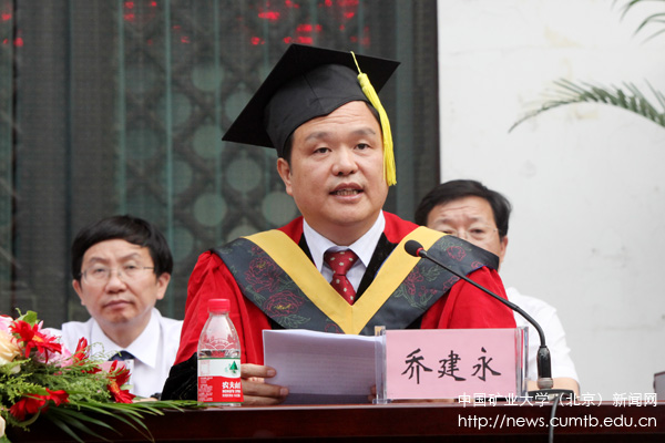 乔建永深情地对同学们说,从大家进入校园的那天起,人生便与矿大结缘。大家就像来自四面八方的种子,在矿大生根发芽,茁壮成长,满结硕果。几年来,同学们在这里激扬文字,勤学苦读。教学楼里曾点燃多少憧憬与渴望,林荫道上曾记录多少凝思与遐想,田径场上曾挥洒多少激情与汗水,课堂校园内外曾展示多少自信与昂扬。在这里,我们共同庆贺了祖国60周年华诞;在这里,我们喜迎中国矿业大学百年庆典;在这里,同学们与学校“风雨同舟、和衷共济”,共同见证并参与了学校的改革与发展,共同承载并分享了学校的光荣与梦想!他代表学校向积极参与学校建设和发展的同学们表示衷心的感谢!