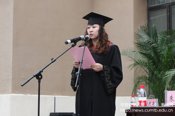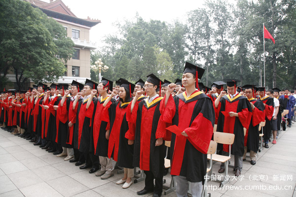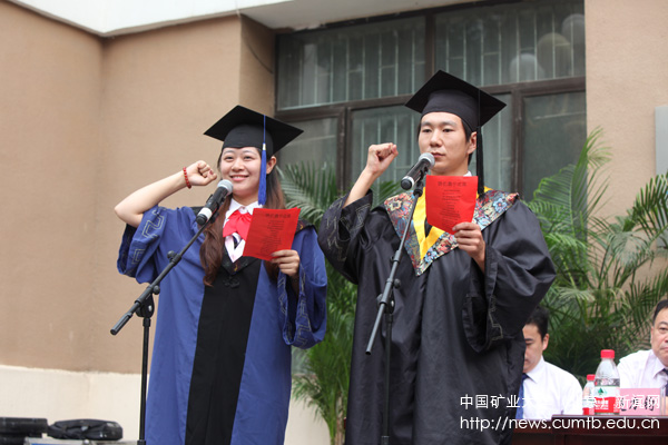 随后,全体2012届毕业生举起右手,庄严宣誓:“值此毕业离校之际,我郑重宣誓:铭记师长教诲,弘扬矿大精神,崇尚科学、追求真理,艰苦奋斗、勇于创新,迎难而上、不断进取,奉献社会、服务人民,肩负起时代赋予的光荣使命,为祖国富强不辞劳苦,为民族的复兴奋斗终生!”掷地有声的誓言在民族楼广场响彻,毕业生们的心在激动中不舍。