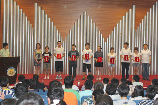 各学院辅导员为“‘我的微成功’主题班级活动”、心理健康知识竞赛,“‘我的微爱’微博短故事征集大赛”、“寻找校园最灿烂的笑容”摄影大赛中获奖的团体及个人颁发了荣誉证书,共计颁发市级和校级奖项50余项。学生代表丛洋、路贝、白雪飞和马超群同学分别代表获奖团体或个人发言,与大家分享在活动中的体验与成长。新换届的心理协会会长及各部门负责人集体和与会人员见面,顺利完成新老交接。
