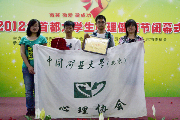 5月25日上午,“2012年首都大学生心理健康节”闭幕式及颁奖典礼在北京交通大学举行,我校心理健康教育与咨询中心教师项丽娜、心理协会会长王凯其、协作部部长丛洋和网络部部长张建程参加了会议并领奖。