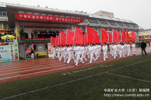 上午8:00,副校长范迅宣布运动会开幕。运动场上红旗招展,彩绸飘扬,气势如虹,气氛和谐而热烈。在激扬的运动员进行曲中,护旗手庄严地护送五星红旗入场,整齐、气宇轩昂地走过主席台;裁判员代表队、教职工运动员代表队和来自8个学院的学生运动员代表队迈着整齐的步伐,喊着洪亮的口号,激情满怀、斗志昂扬地走过主席台。多姿多彩的队形、铿锵有力的步伐、绚丽华彩的服装、整齐划一的队列、斗志昂扬的士气,博得了全场阵阵掌声,充分展现出矿大师生团结奋进、健康向上、积极进取的良好精神风貌。