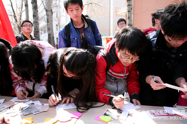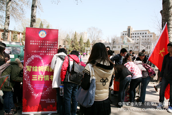 春暖大地,北燕南归。3月27日,由校党委宣传部主办、校大学生记者团承办的“写给妈妈的三行情书”活动在篮球场西侧举行。活动气氛活跃,情感真挚,同学们纷纷写下令人感动的“三行情书”,抒发自己对母亲、对敬者的爱,让初春的矿大校园里充满了浓浓的感动,涌动着暖暖的温情。