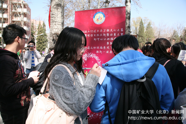 用“三行情书”的活动形式,唤起矿大莘莘学子的感恩之心,让同学们以微情书的方式表达自己心中对母亲、对敬者的感激和爱意,是这次活动的初衷。为了办好这次活动,校大学生记者团精心组织策划,购买了精美的明信片,制作了海报,悬挂了爱心绳,并进行了广泛的前期宣传和准备。