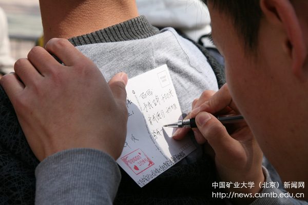 “妈妈,等着我的明信片吧!”有的同学通过短信、电话告诉了妈妈,更多的同学想给妈妈一个意外的惊喜。据悉,校大学生记者团将在每张明信片上盖上印有矿大学生的特殊戳记,并将认真投递所有活动参与者所写的“三行情书”。