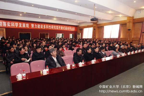 在全国深入学习贯彻党的十七届六中全会精神和《国家中长期教育规划纲要(2010-2020年)》的热潮中,2月28日下午,我校在国际交流中心学术报告厅召开2012年工作布置大会,总结2011年工作,重点对2012年工作进行部署。校党委书记杨仁树,校长乔建永,副校长孙继平、范迅、姜耀东、王忠强,校党委副书记朱书全,中共北京市委教育工委联络员范国英等出席会议。全校副高级职称及以上教师,各学院副科级及以上干部、机关教辅副科级及以上干部,后勤各中心主任,离退休同志代表等200余人参加了大会。杨仁树主持了会议。
