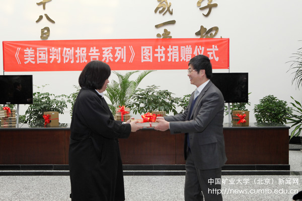 在热烈的掌声中,杰出海外校友朱红女士向母校捐赠《美国判例报告系列》图书,副校长孙继平代表学校接受了捐赠,并向朱红校友颁发了捐赠证书。